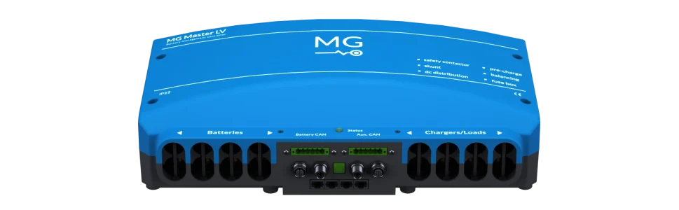 With the built-in CAN-Bus connectors, the Master LV communicates with the MG batteries, chargers/loads, and third-party devices. The two left-side ports are reserved for communication with the batteries. The two right-side ports are for auxiliary communication. Different CAN-Bus protocols are available in the BMS software. NMEA2000 is the most common protocol. The Master LV includes both RJ45 and M12 connectors. This makes it suitable for any application.